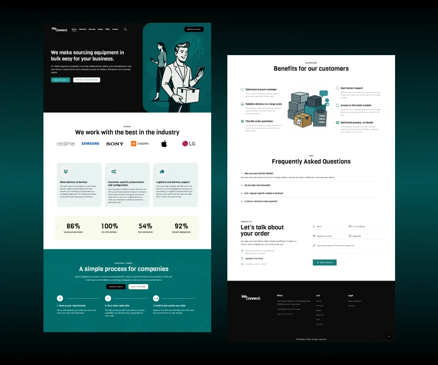 Weconnect ist ein Smartphone-Anbieter in Deutschland, der mit vertrauenswürdigen Marken zusammenarbeitet und Geräte an Einzelhändler und Unternehmen im ganzen Land liefert. Wir haben ihre Website mit einem klaren, einladenden Design gestaltet, damit Besucher die angebotenen Dienstleistungen und die bekannten Markenpartner leicht entdecken können.